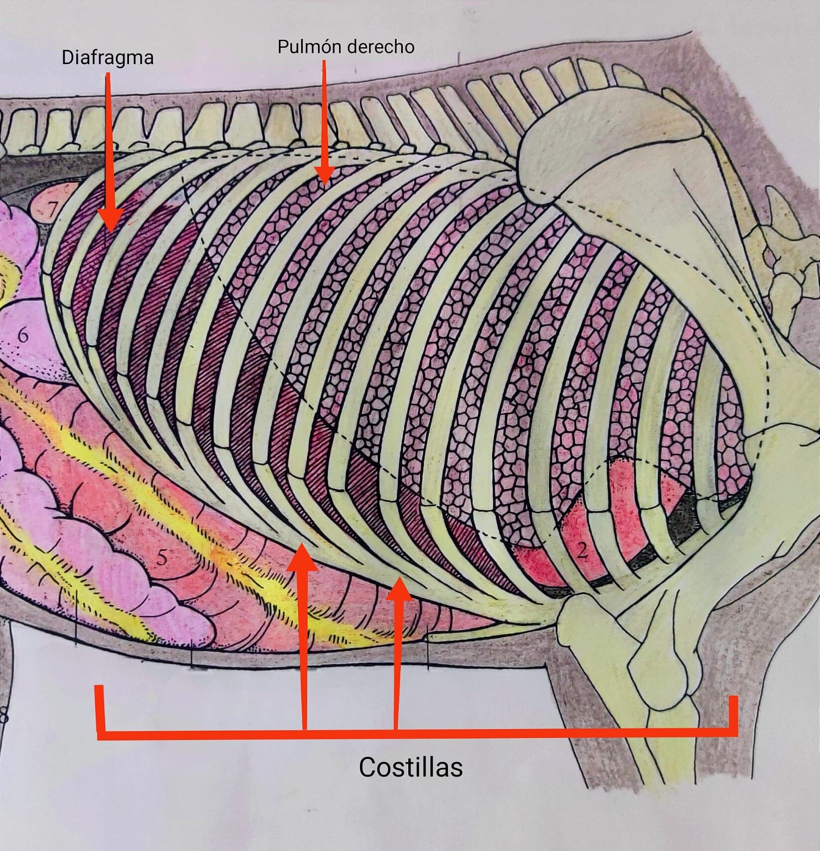 El esqueleto de los equinos está compuesto por 18 costillas, aunque algunos caballos de raza árabe pueden poseer únicamente 17. Las costillas son huesos fuertes en el caballo adulto y para que se produzca una fisura o fractura costal es necesario un gran impacto en el tórax.